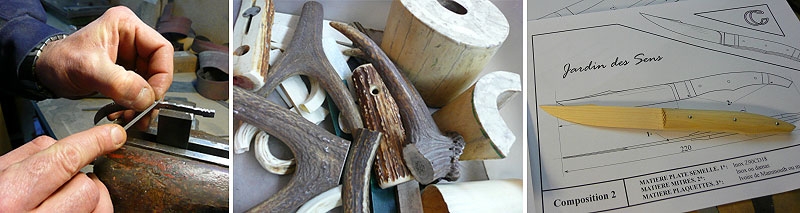 J&L Pourcel et Olivier Château ont demandé à l’artiste de créer un couteau de table pour Le Jardin des Sens. Tous les trois rêvent d’un couteau qui portera l’empreinte de leur histoire, entre le Laguiole et le Languedoc, entre modernité et tradition, entre praticité et design. Le modèle retenu sera sobre, avec une bonne prise en main, une longue lame légèrement crantée à son extrémité.